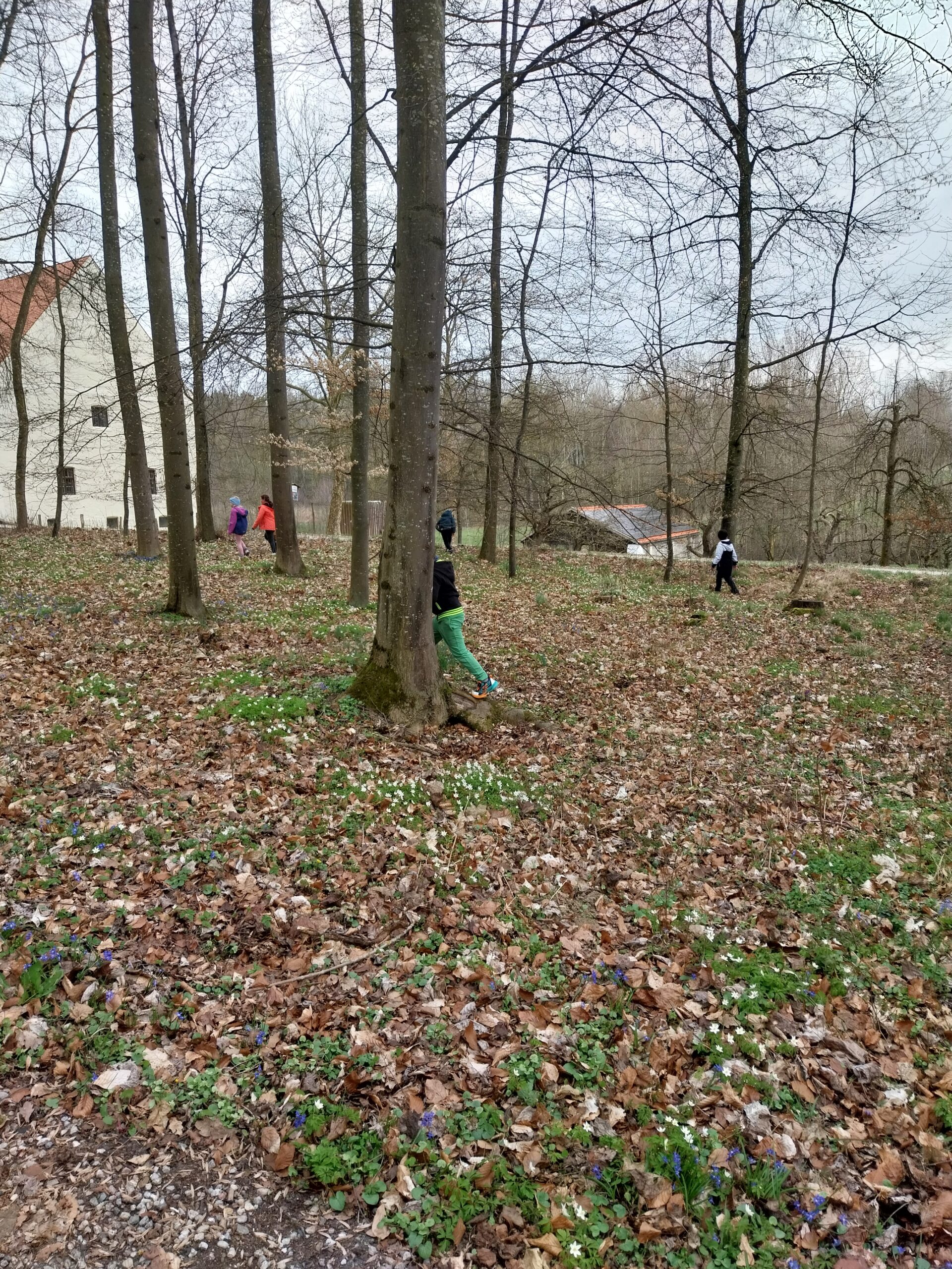 Die beiden Kindergartengruppen gehen regelmäßig in den nahe gelegenen Wald um diesen zu erkunden. Dabei legen sie Naturmandalas, bauen einen Kaufladen, eine Bewegungsbaustelle, bauen ein Haus oder singen den Tieren ein Lied.